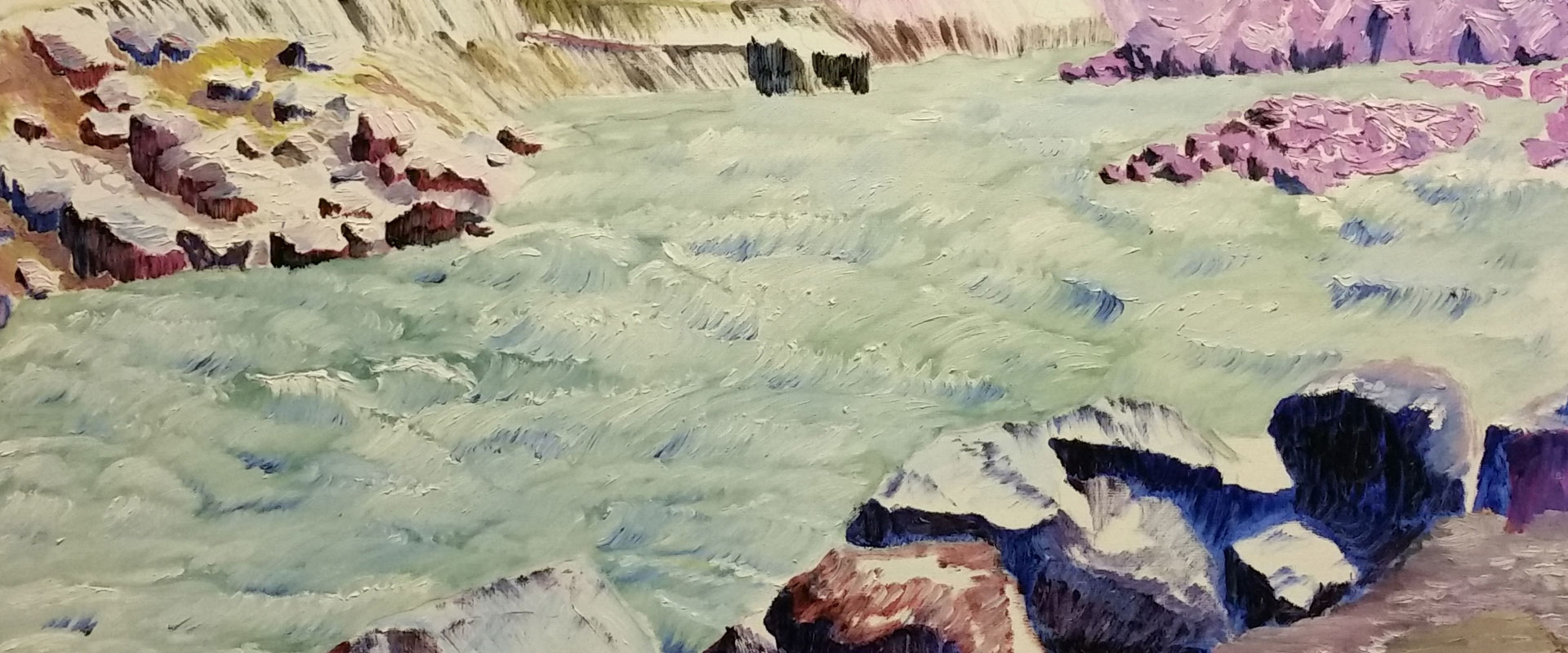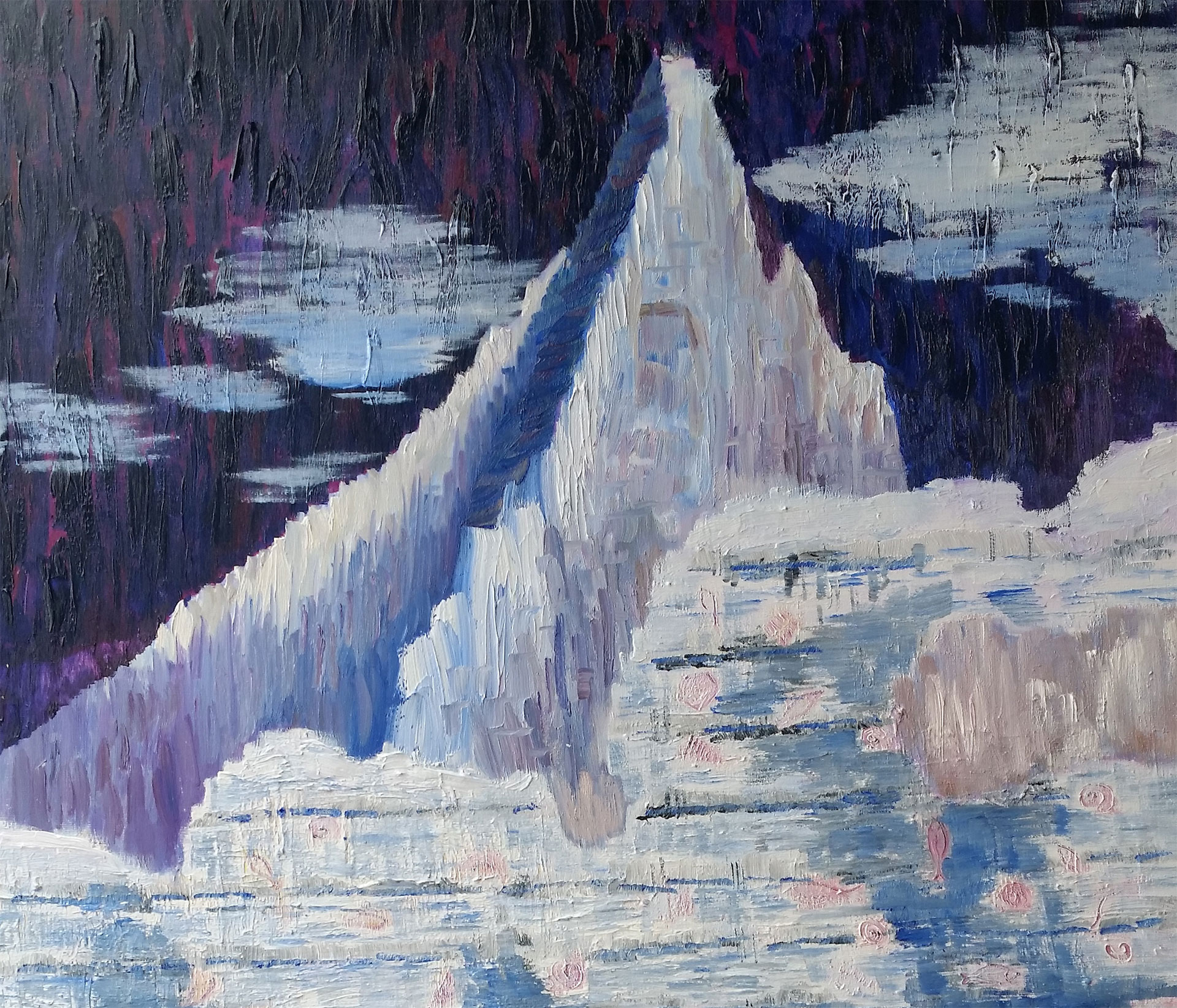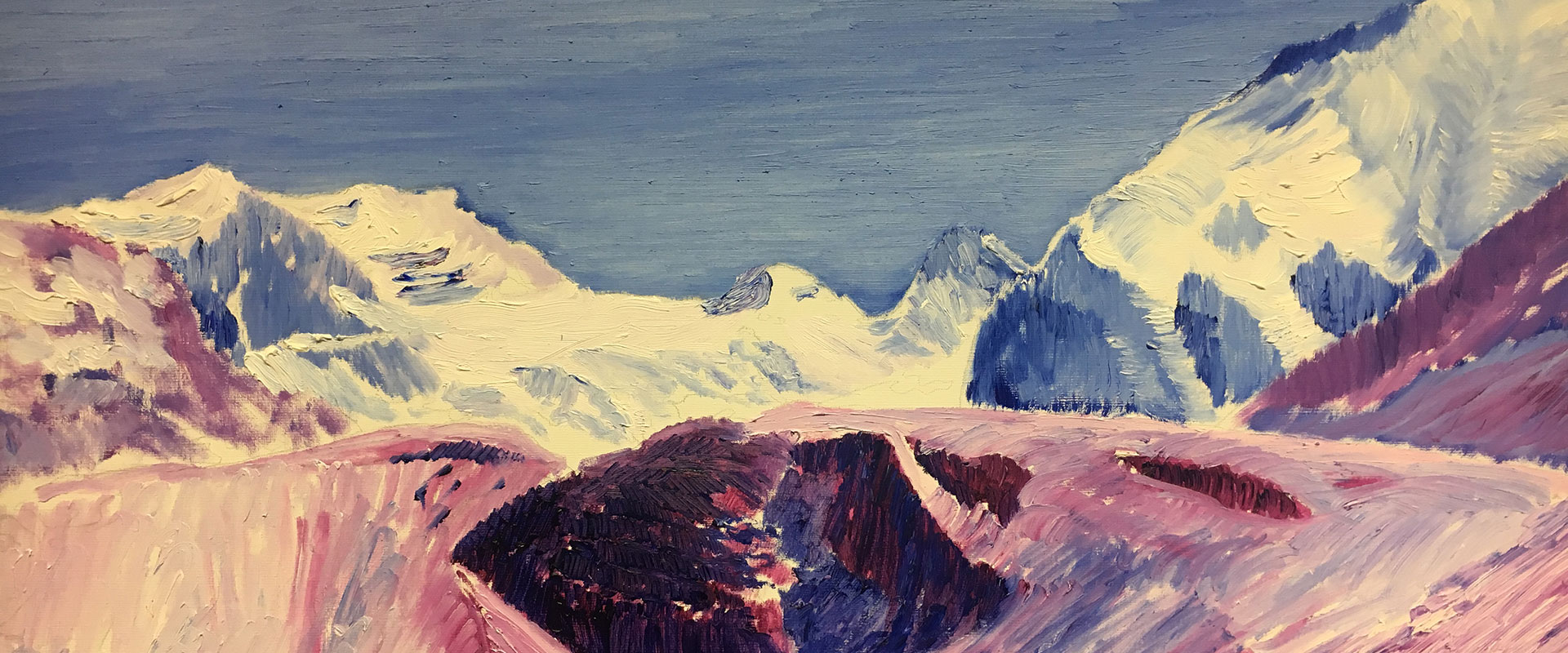 Wenn ich privat zum Malen komme, ist es mein Interesse an den Alpen, als geologisch, ökologisch und kulturell faszinierender und zugleich gefährdeter Raum, dessen Themen und Motive meine Bilder prägen, wie das Bildbeispiel vom Morteratschgletscher in der Bernina Gruppe zeigt. Dieser Gletscher ist aufgrund seines dramatischen Rückganges in den letzten Jahrzehnten im Bild eher einer Wunde gleichend dargestellt, in Wirklichkeit schmilzt er unter einem dunklen Schuttbelag dahin. Der Bach im Vordergrund besteht nur aus Gletscherwasser. Was gewaltig und massiv erscheint, ist in Wirklichkeit fragil und veränderlich.